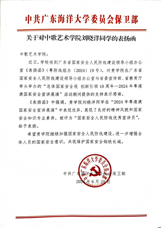 关于对必赢亚洲 刘晓洋同学的表扬函