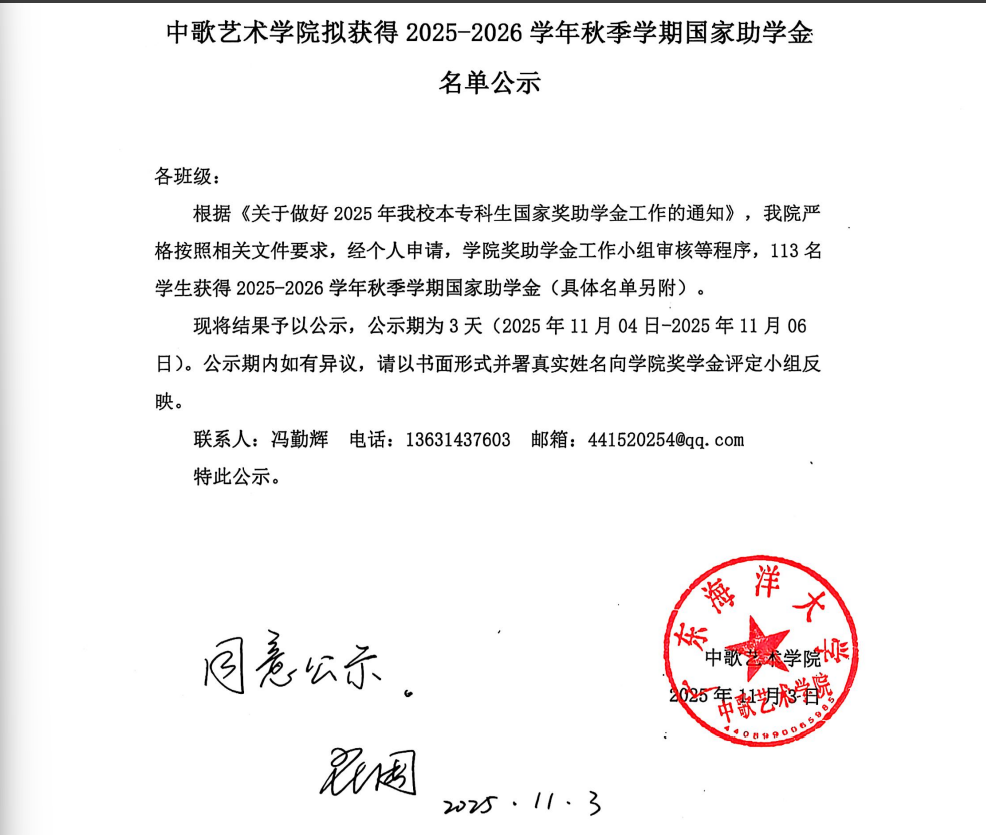 必赢亚洲 拟获得2025-2026学年秋季学期国家助学金名单公示